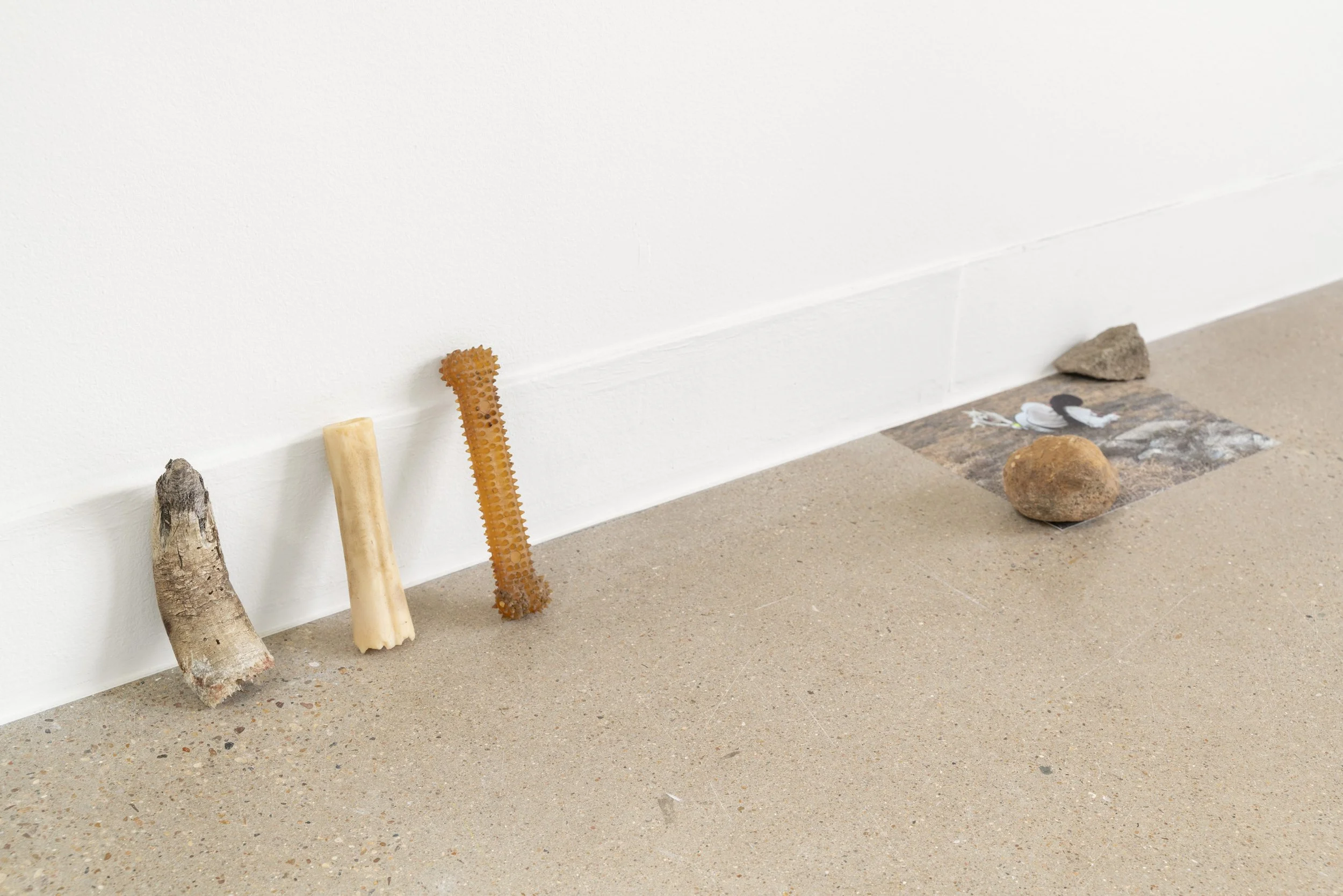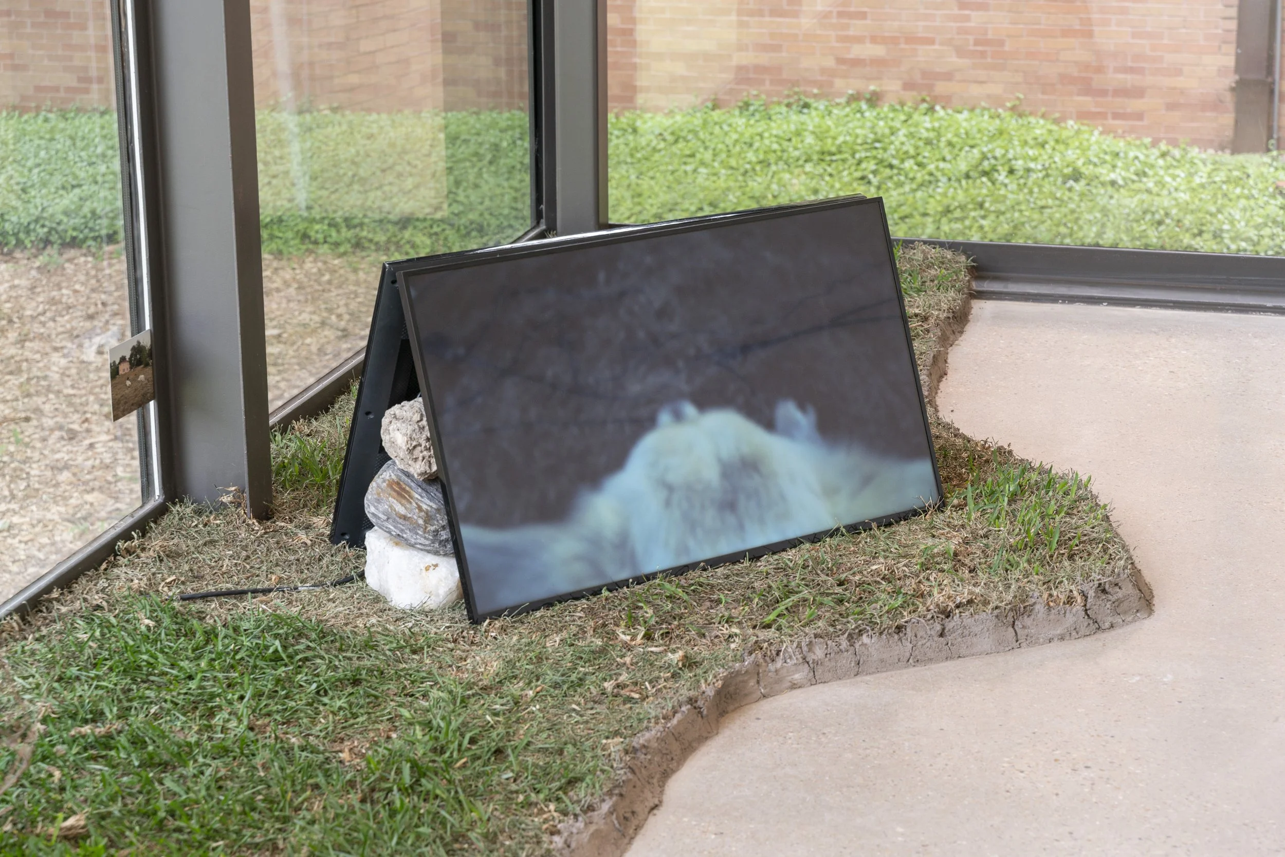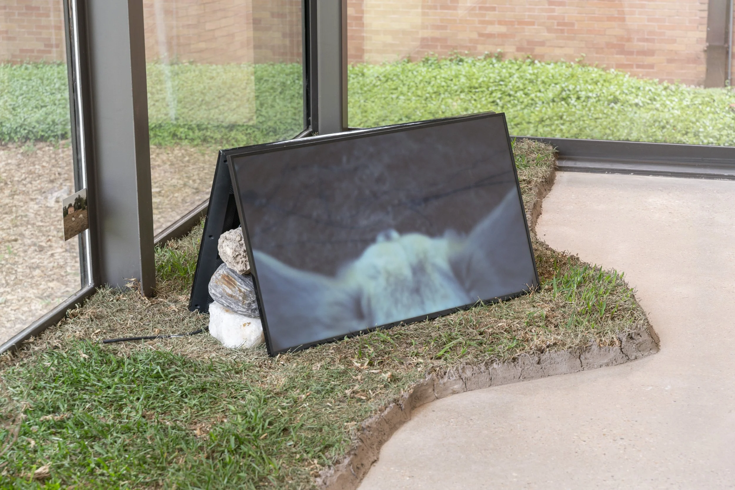 Live grass, monitors, iPad, iPhone, speaker, media players, photographic prints, found objects, dog toys, dog fur, human hair, park benches, aura photograph, pet psychic session, field recordings, performance, charcoal drawing, bones
