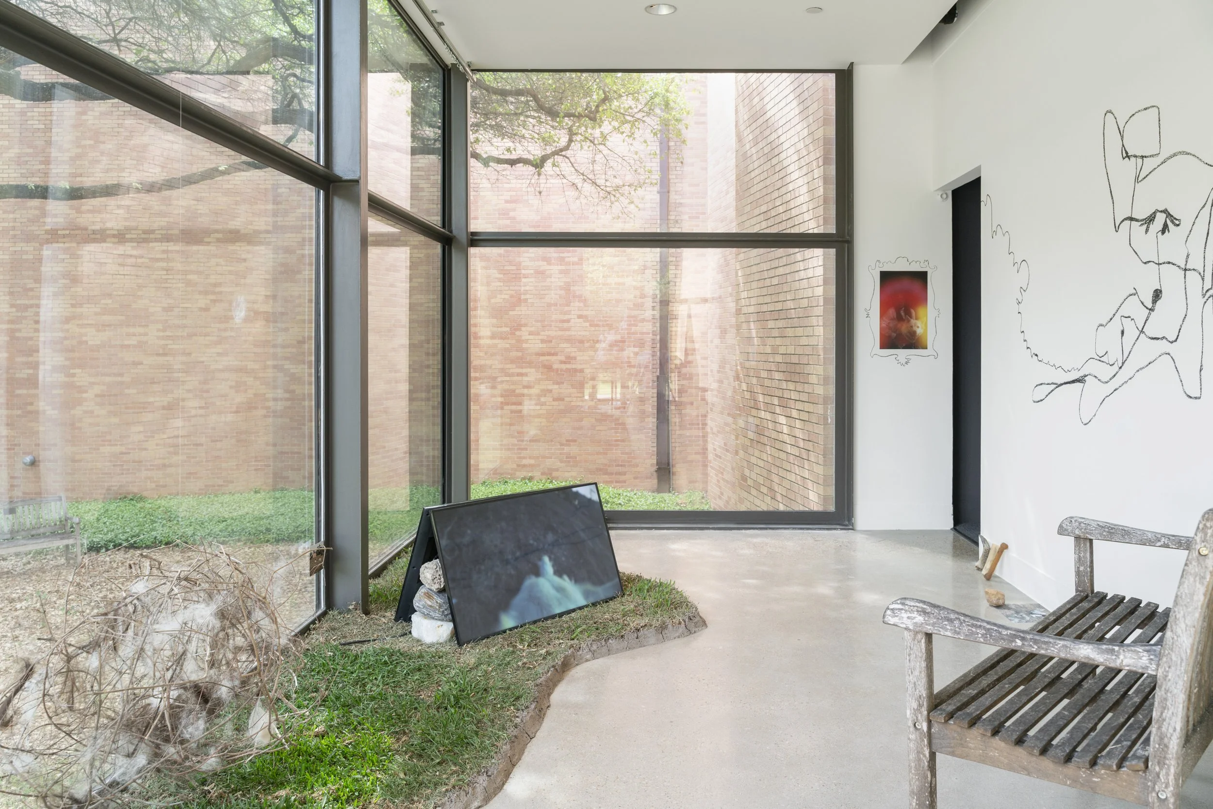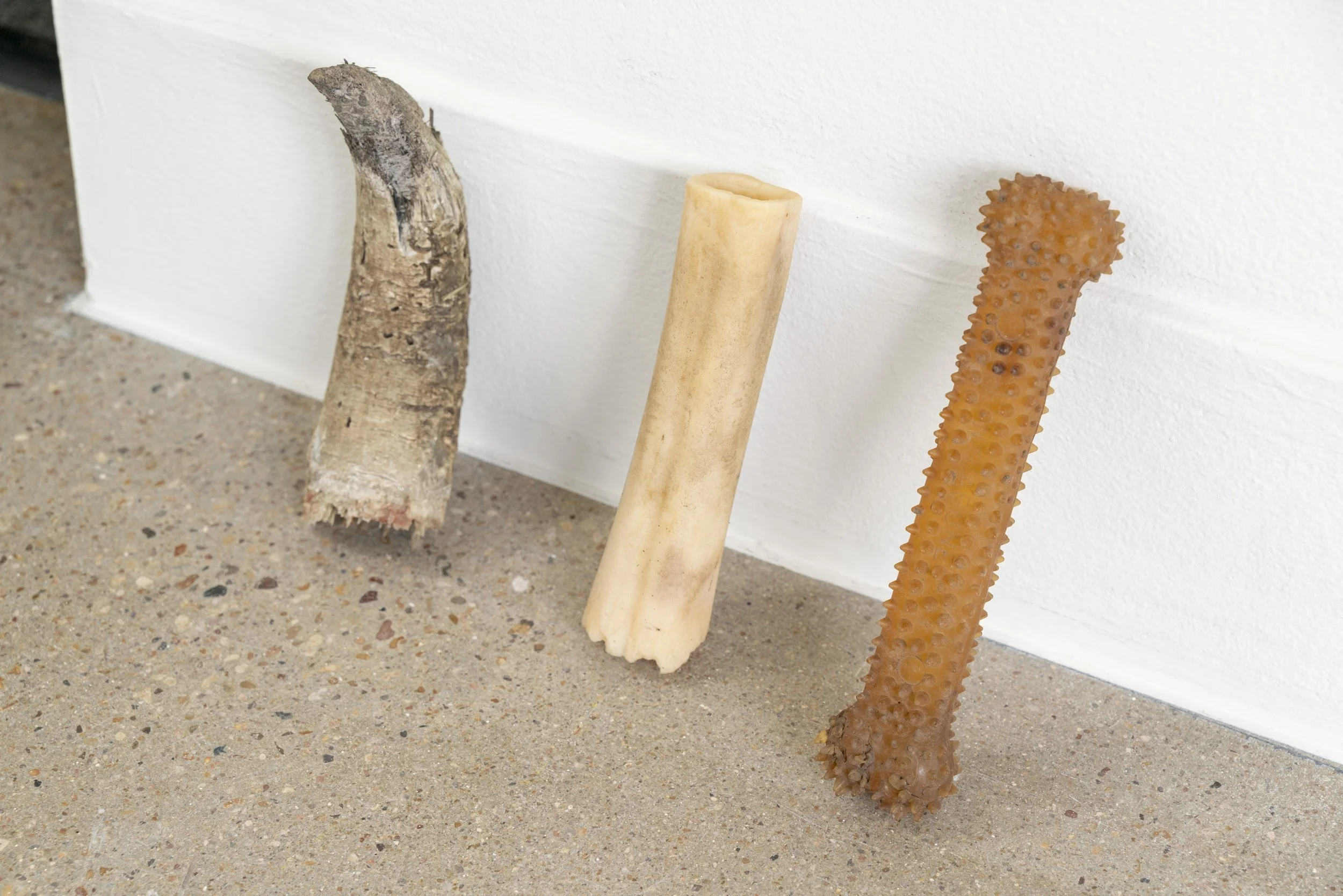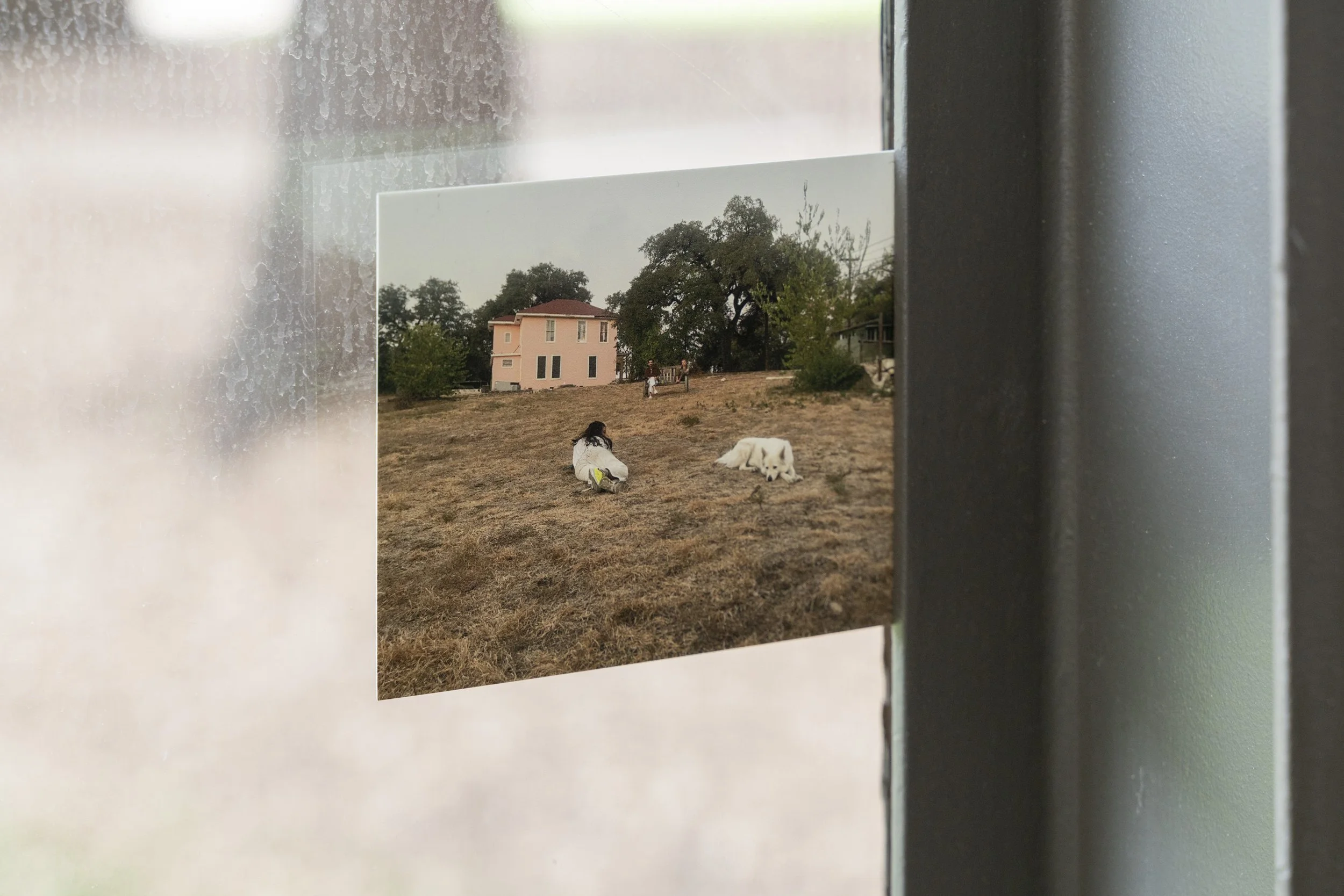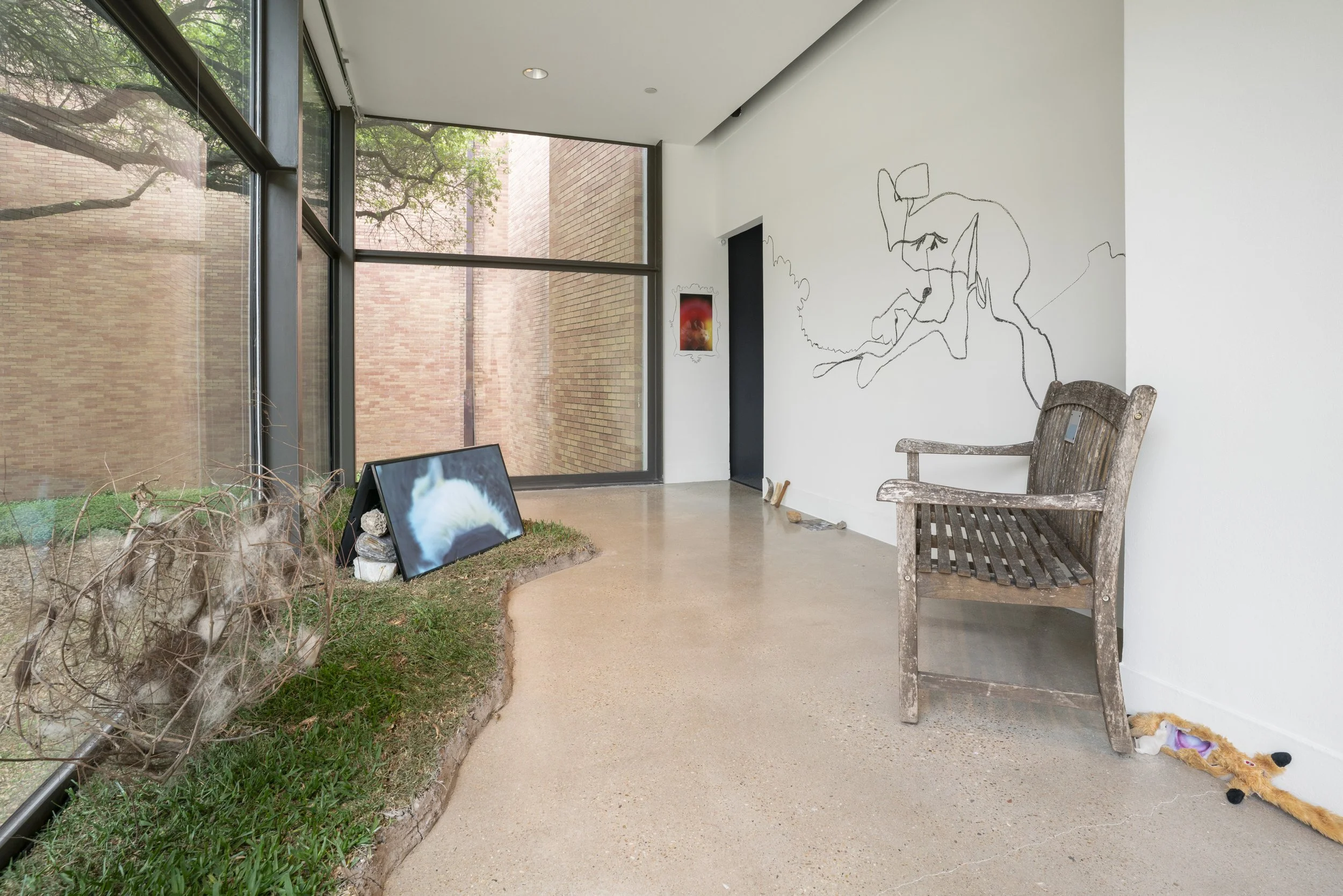 Live grass, monitors, iPad, iPhone, speaker, media players, photographic prints, found objects, dog toys, dog fur, human hair, park benches, aura photograph, pet psychic session, field recordings, performance, charcoal drawing, bones